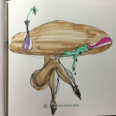 생각을 지탱하는 테이블 (Table of Thoughts)라는 주제로 6월에 개인전을 했는데요, 테이블을 전시 주제로 정하게 된 계기는 여성의 나체를 닮은 나무 가구들이 한 식물원에 쭉 진열되어 있는 몽환적인 꿈을 반복적으로 꾸면서부터였어요. 저는 항상 기괴한 꿈을 많이 꿔서 침대 테이블 옆에 스케치북을 놓고 일어나자마자 꿈에서 본 것을 그려요. 꿈에 카메라를 가져갈 수 없으니 반쯤 깬 몽롱한 상태로 스케치하며 조금이라도 남겨두는 거죠. 나중에 맨정신에 스케치를 보면 아이가 그린 것처럼 순수하고 원초적인 형상이 재밌게 느껴지곤 해요. 이 방법이 본능적인 무의식을 잘 끌어낸다고 생각해서 매일 이런 식으로 드로잉하고 있어요.